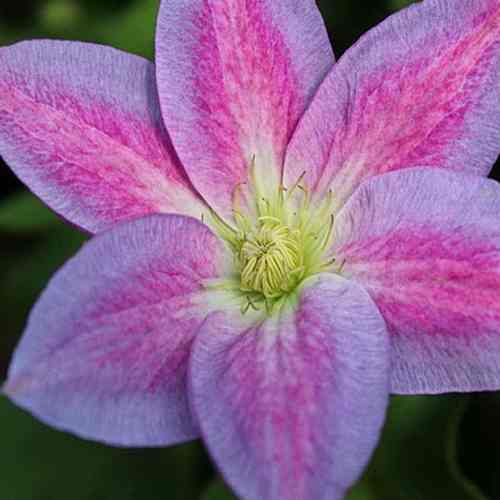 Цветет длительный период: с мая по июль на новых побегах и прошлогодних, нередко культура сорта цветет повторно. Цветок простой формы с 6 чашелистиками. Размер средний – около 10-13 см. Отличается от других за счет своего интересного окраса, который за период цветения меняется от пурпурно-красного до светло-розового. При появлении цветки имеют пурпурно-красный цвет, на пике цветения – красно-розовый, а по окончании они светлеют. Также у чашелистиков имеется светло-розовая, слегка голубоватая окантовка и светлая, почти белая у основания, полоса посередине. В сердцевине цветка располагаются тычинки с желтыми пыльниками на нитках зеленого цвета и со столбиками желтого оттенка.